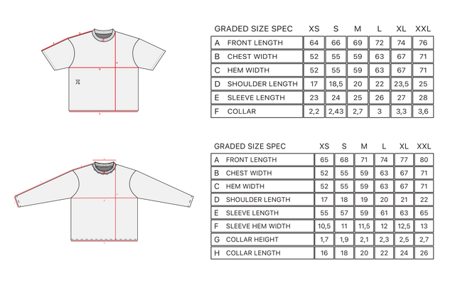 Pattern Tee: Boxy oversized fit. Wasiu is 1.93 and wears a size XL, Sammy is 1.76 and wears a size M. Long Sleeve Stone Blue: Boxy oversized fit. Ramah is 1.80 and wears a size L, Terna is 1.66 and wears a size S.